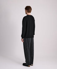 衿と袖のリブがクラシックな編地で、やや緩みを付けたサイジングがリラックスした印象になっています。